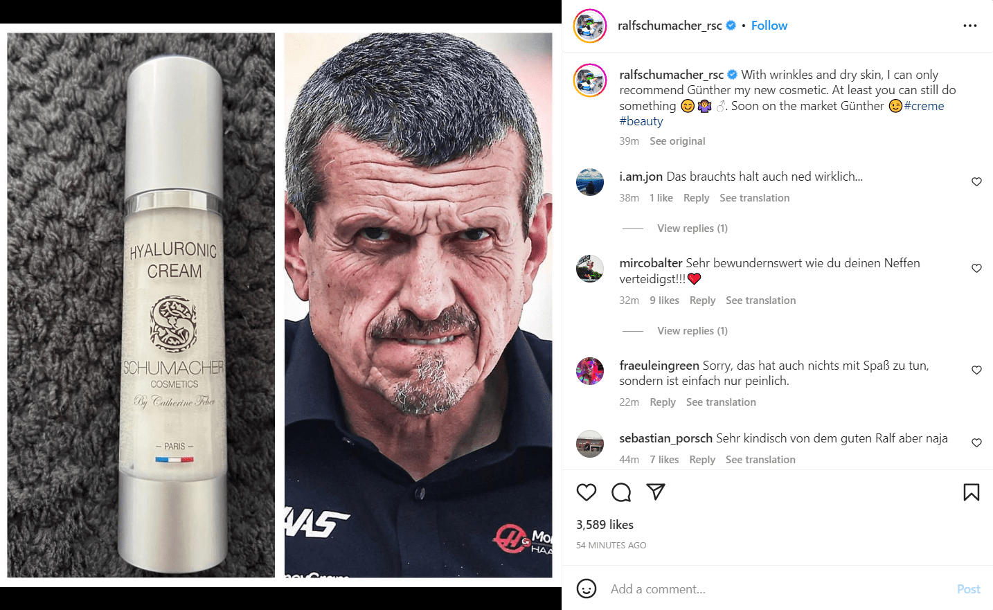Ralf Schumacher – uncle of Mick – continues to poke Guenther Steiner, this time on social media with his new cosmetic cream.