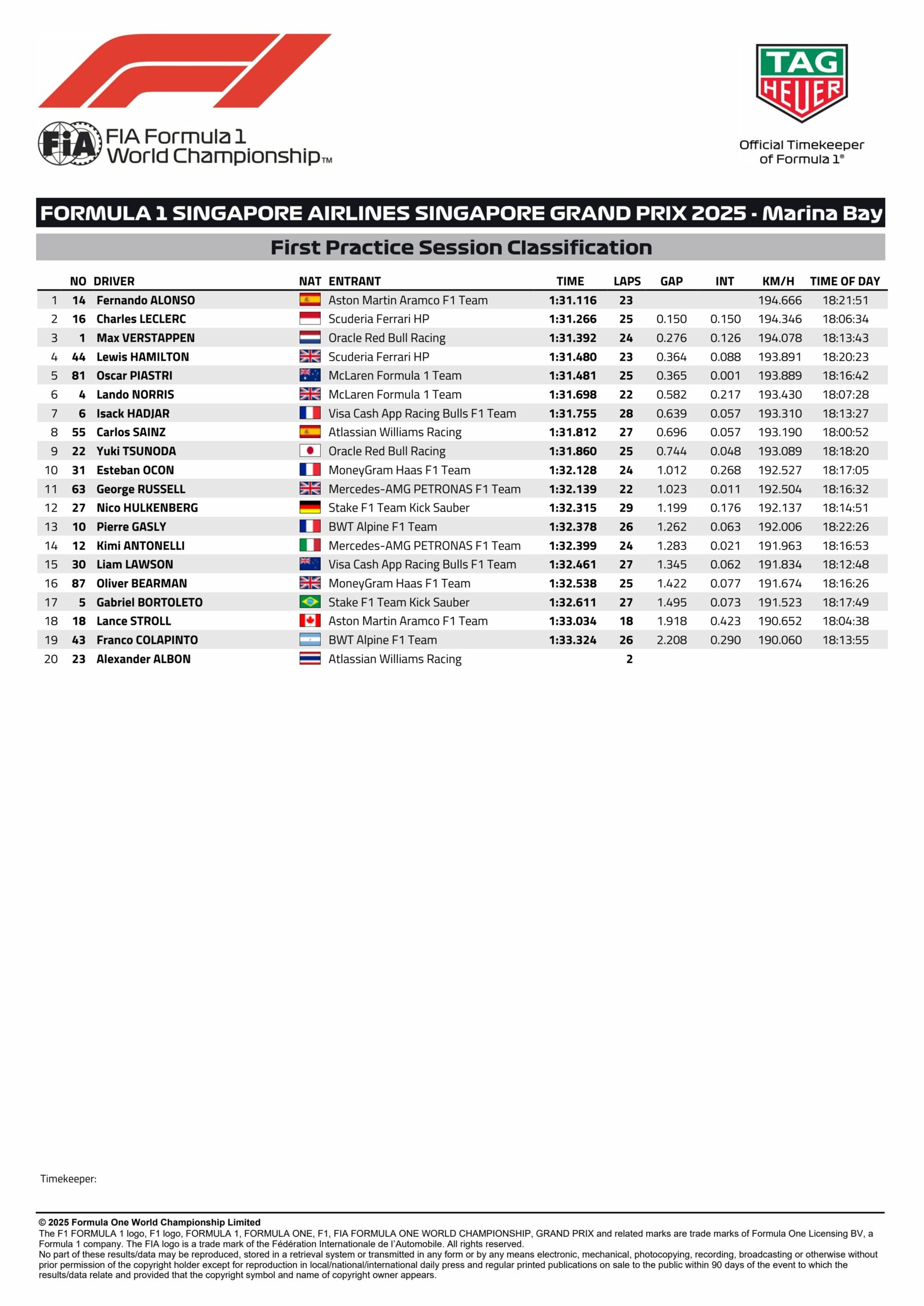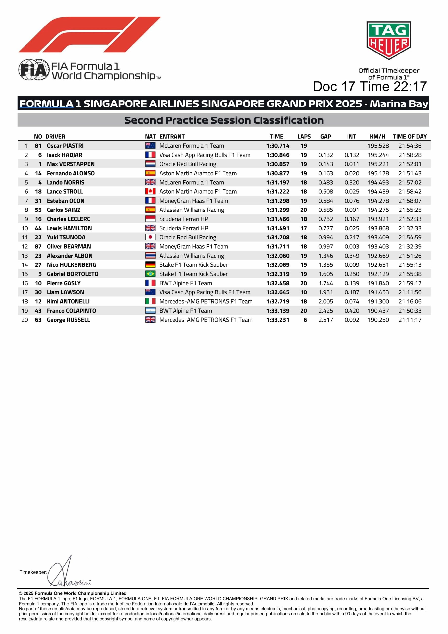 Despite some traffic and a brush with the wall, Piastri improved significantly to edge out Norris for fifth, followed by Hadjar, Sainz, the second Red Bull of Yuki Tsunoda and Haas racer Esteban Ocon, who rounded out the top-10 positions. Mercedes had a quiet start to the weekend as George Russell and Kimi Antonelli wound up 11th and 14th respectively, split by Nico Hulkenberg and Gasly, while Liam Lawson, Ollie Bearman, Gabriel Bortoleto, Lance Stroll, Franco Colapinto and the sidelined Albon brought up the rear.