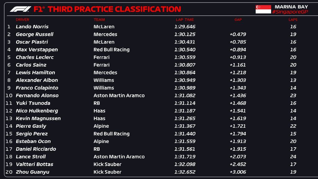 The soft tyre run saw McLaren’s Lando Norris set sound pace to top FP3 in F1 Singapore GP with a 1m29.646s lap, as he was 0.479s ahead of Mercedes’ George Russell in the process. The latter had multiple run-off moment as he continued to fight the circuit.