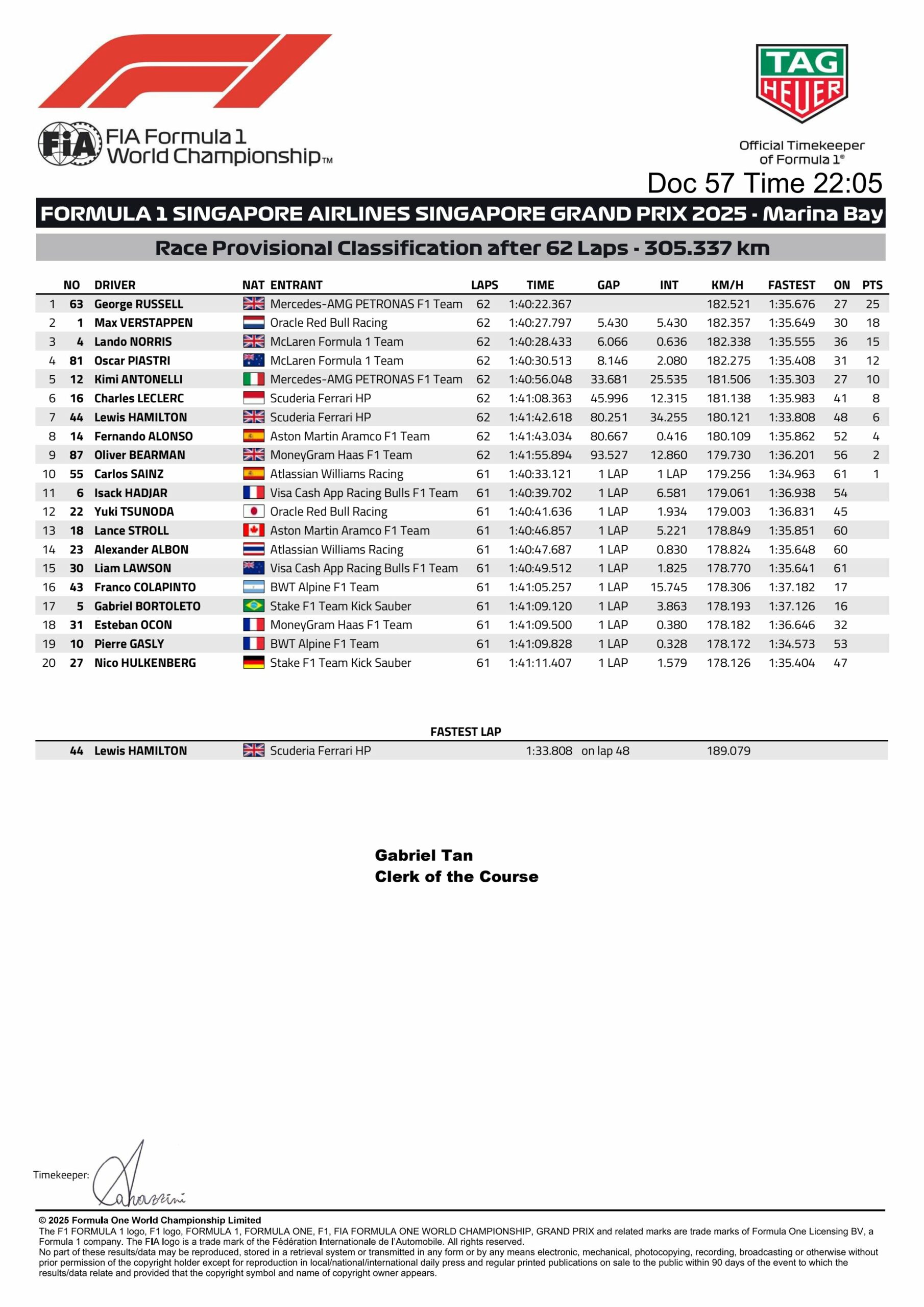 After Antonelli cleared Leclerc, Hamilton got through the Monegasque in the chase of the Italian. He got on his tail but with no chance of passing after a minor wall brush, he let Leclerc through again. Up front, Russell took the F1 Singapore GP win by 5.430s margin in a dominant fashion.