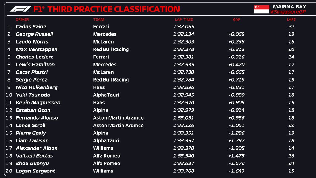 Carlos Sainz remained on top in FP3 of F1 Singapore GP as he led George Russell and Lando Norris, with no Red Bull in Top 3.