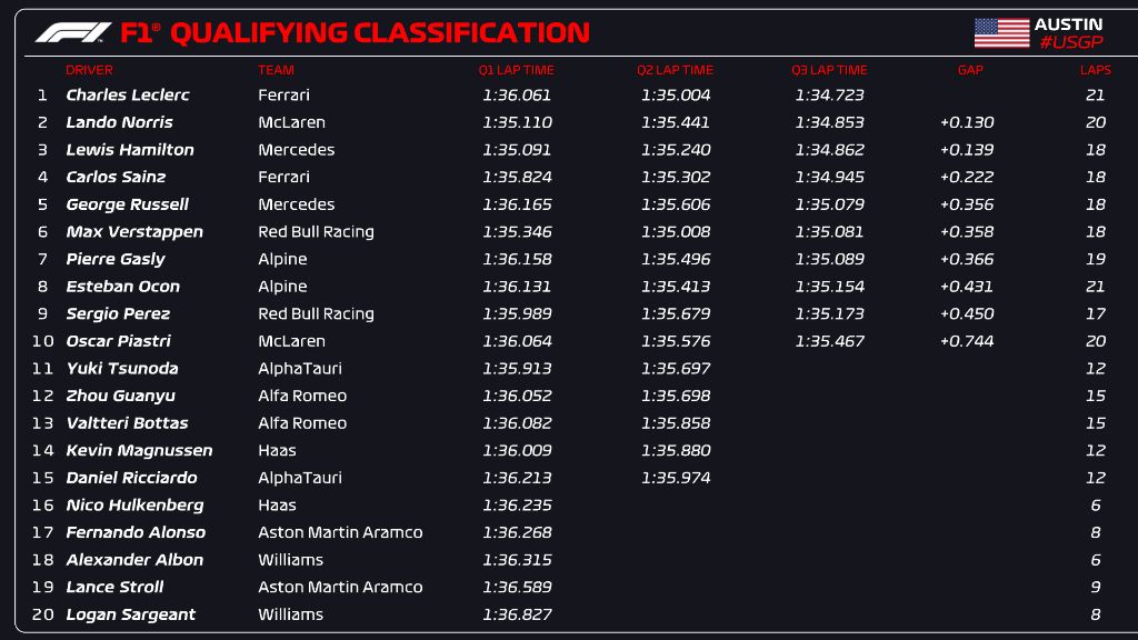 The final part in F1 US GP qualifying saw a tasty battle at the front with Leclerc setting provisional pole lap of 1m34.829s lap which was 0.056s quicker than Hamilton and 0.252s quicker than Verstappen, who was only third on the grid.