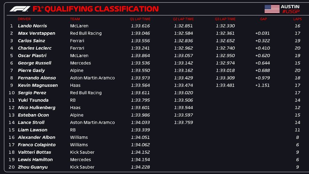 The final part in F1 US GP qualifying saw Norris (1m32.330s) lead the way with provisional pole by 0.031s margin over Verstappen (1m32.361s). Sainz slotted in third from Leclerc, with McLaren’s Oscar Piastri in fifth.
