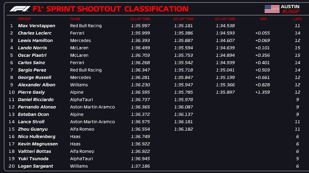 Verstappen maintained his top spot with a 1m34.538s lap to secure F1 US GP sprint qualifying ahead of Leclerc (1m34.593s) and Hamilton (1m34.607s). The Monegasque missed out by just the 0.055s margin with the Brit only 0.069s behind.