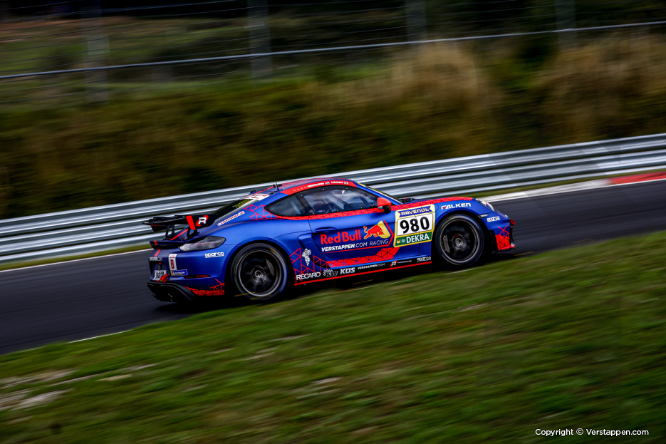 To obtain the special race license for the Nordschleife, Max entered a Porsche 718 Cayman GT4 CS in the well-known Verstappen.com Racing x Red Bull-livery. Max participated in a wet qualifying on Saturday morning and clocked a 10:21.591 after which the F1 star was scheduled to take part in a 4-hour race in the afternoon alongside Chris Lulham. The latter is a 22-year-old Englishman who drives for Verstappen.com Racing in the GT World Challenge Europe Endurance and Sprint Cup.