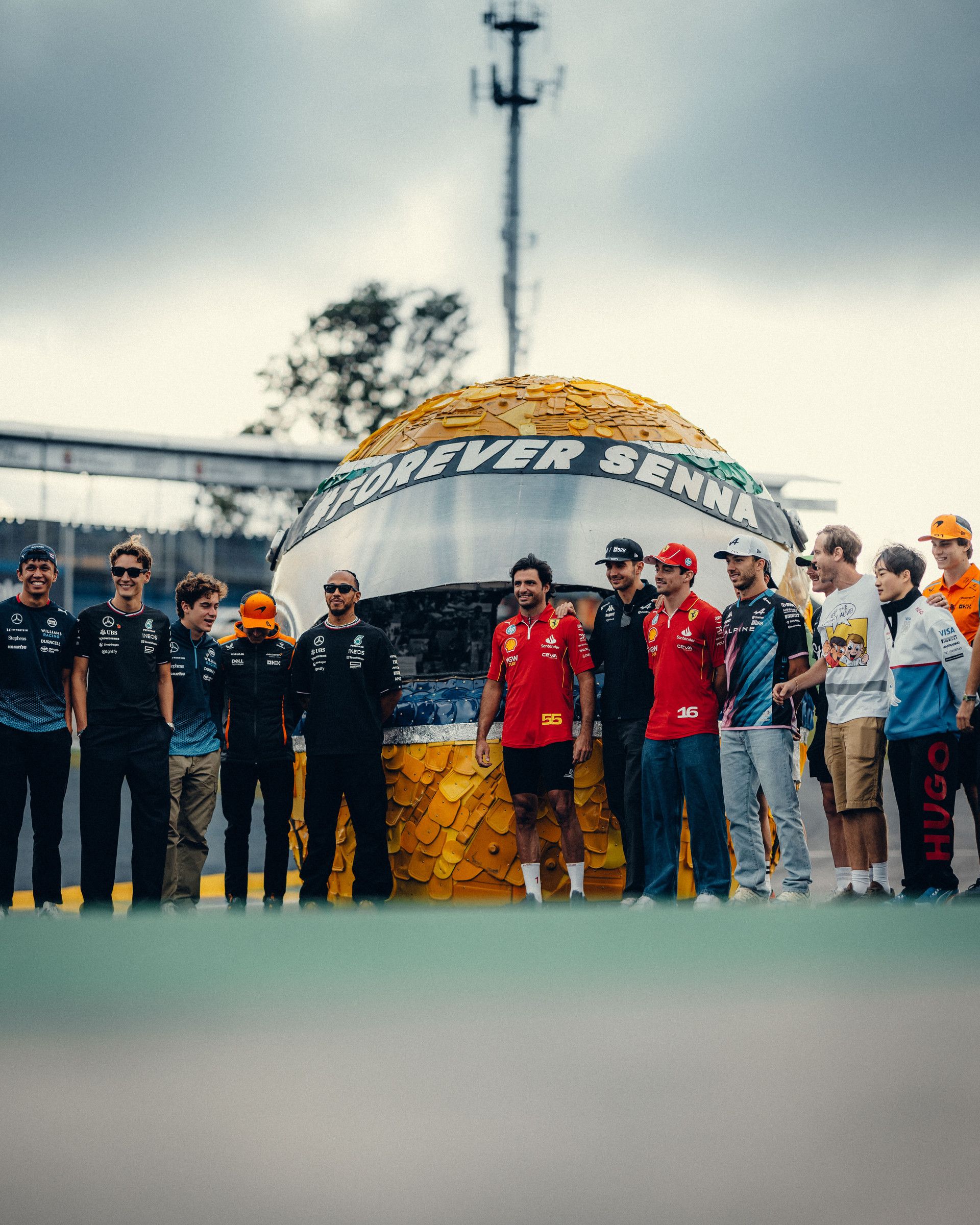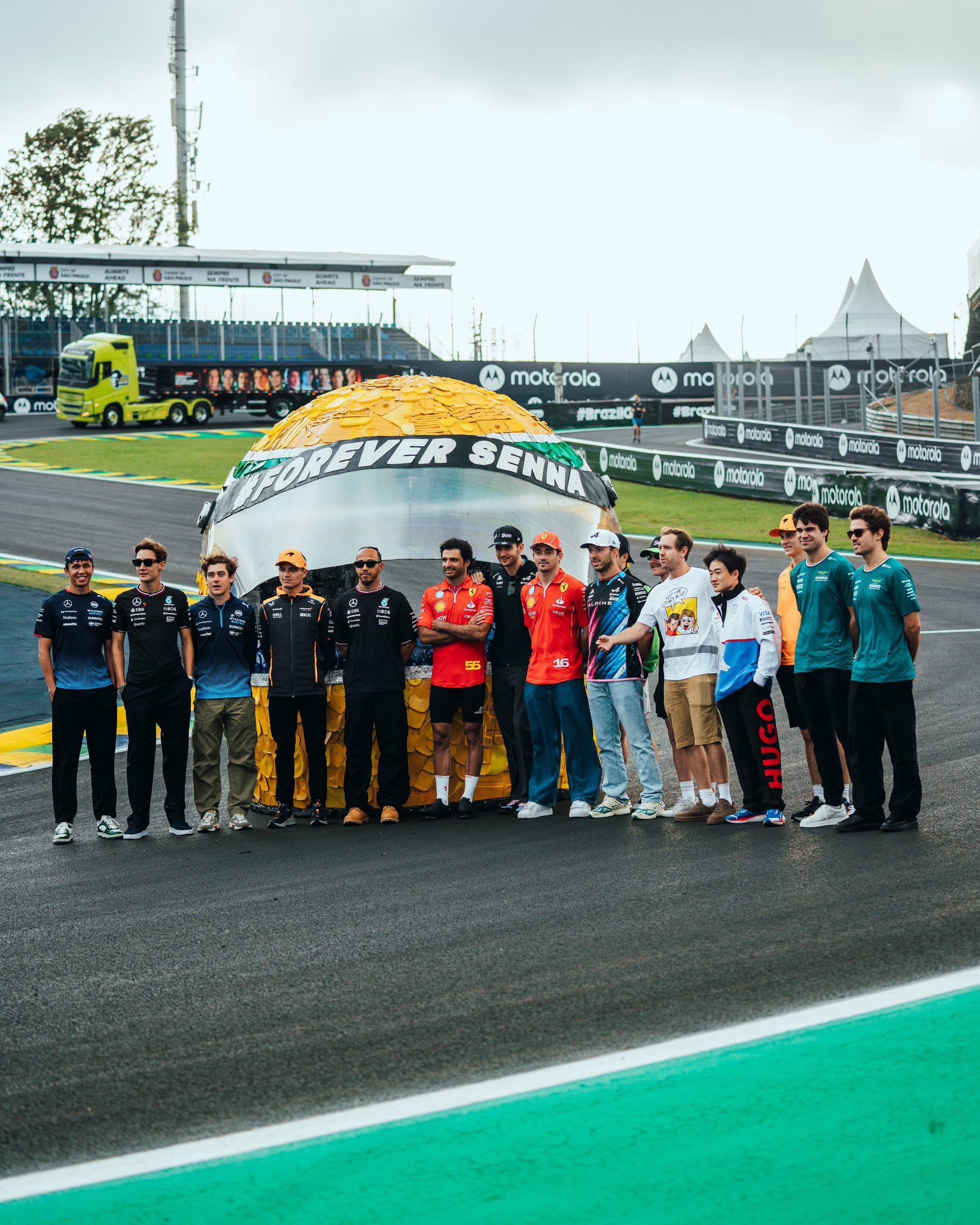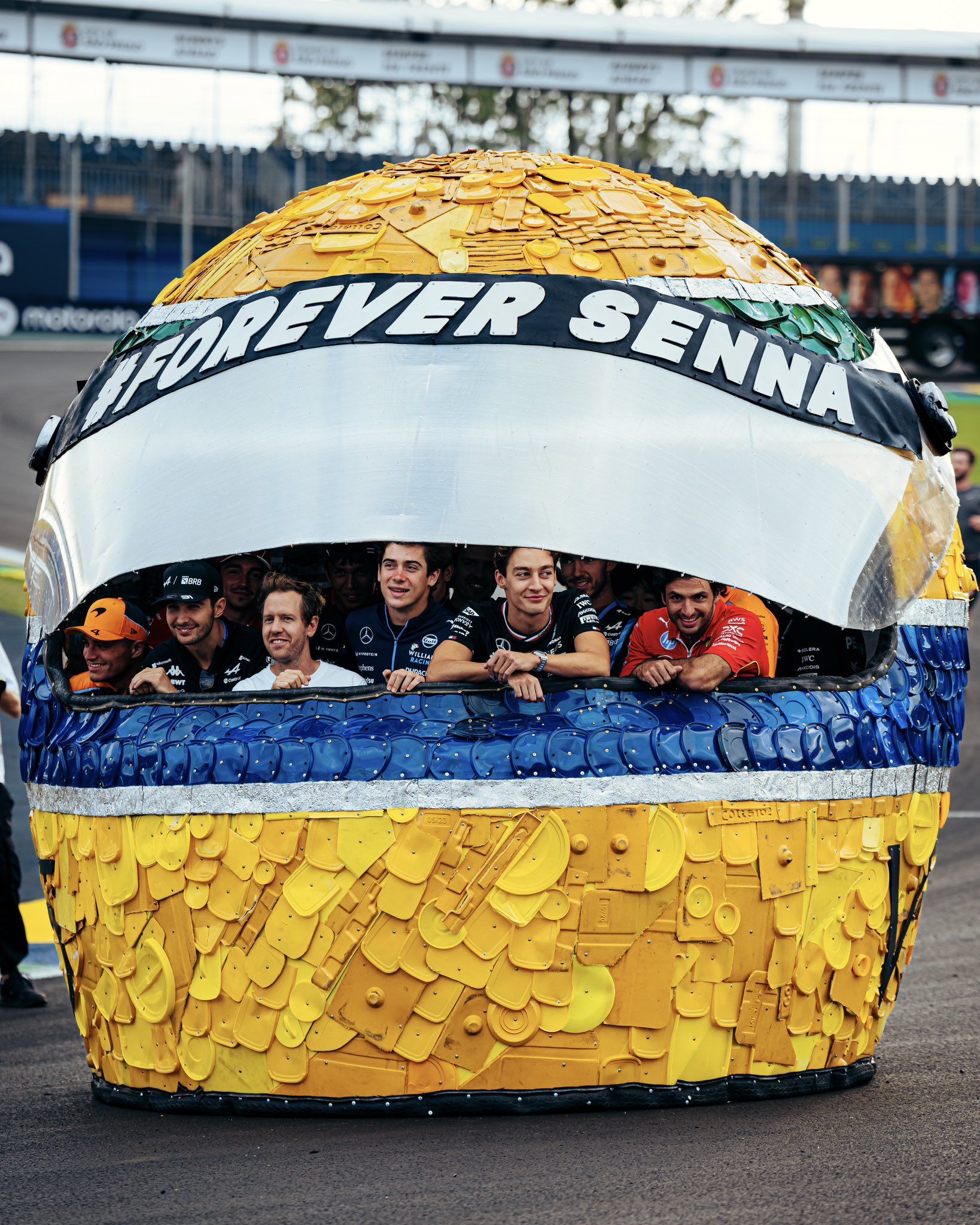 “So we came up with the idea to make this helmet, as it is a strong symbol of recognition for a driver, it’s what you see from the grandstands as a fan and how you recognize a driver. Ayrton had the yellow helmet with the Brazilian colors and we wanted to build that, but do it a little bit differently. We made it 100% from trash that was collected in Sao Paulo and built this helmet. So hopefully it finds a home after this event as well, but obviously we launched it here, it got ready just in time, we finished it in the morning we launched, we collected a little bit more waste as well outside the track. So that’s in short a little bit the story and what we’re trying to do is really to celebrate him and celebrate his legacy and try and build something so that people can understand who he was and who he stood up for. we came up with the idea sort of together. Obviously, you know, very small team and lots of ideas floating around. But after Imola, I think we had such a powerful reception, really wanted to do something in Brazil, in Ayrton’s home country as well.