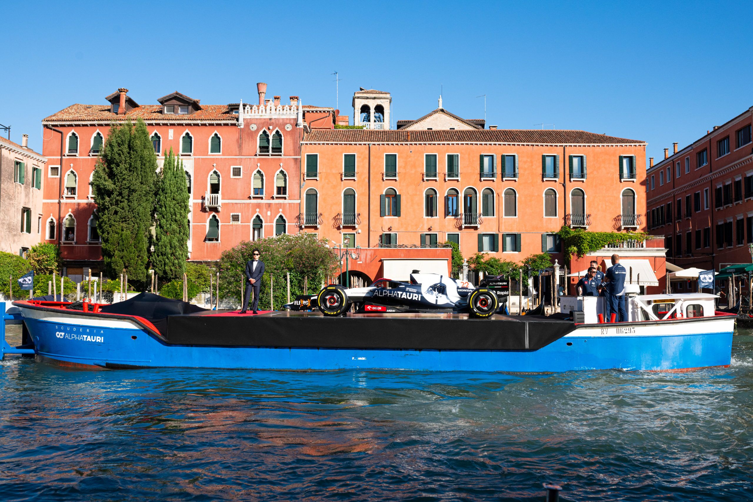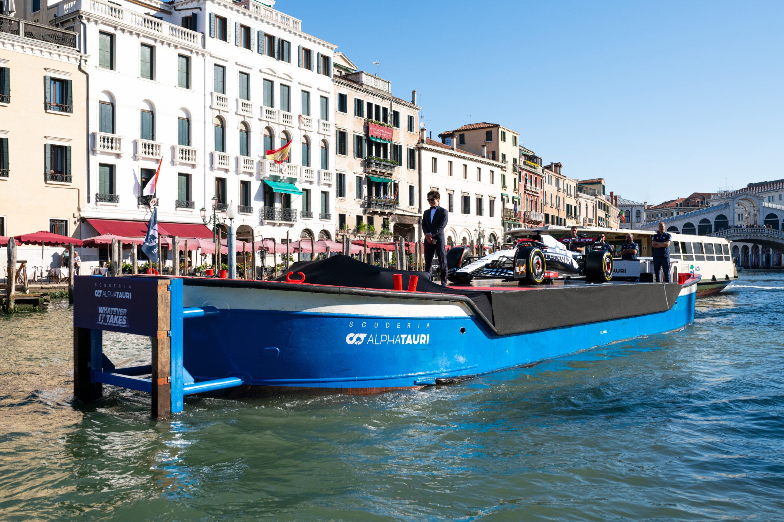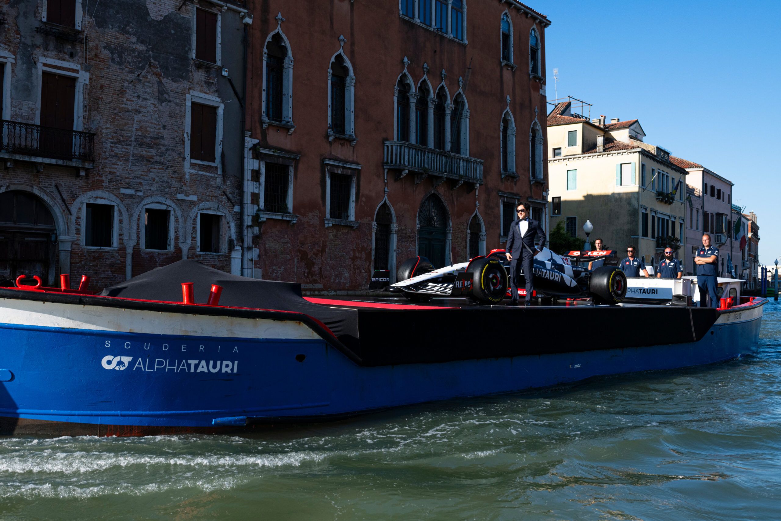 VENICE, ITALY - SEPTEMBER 06: A general view of the Scuderia AlphaTauri AT03 show car and Yuki Tsunoda of Japan on Canal Grande during the Scuderia AlphaTauri Premiere of "Whatever it Takes – the Race before the Races" on September 06, 2023 in Venice, Italy. (Photo by Rudy Carezzevoli/Getty Images for Scuderia AlphaTauri) // Getty Images / Rudy Carezzevoli / Red Bull Content Pool // SI202309060249 // Usage for editorial use only //