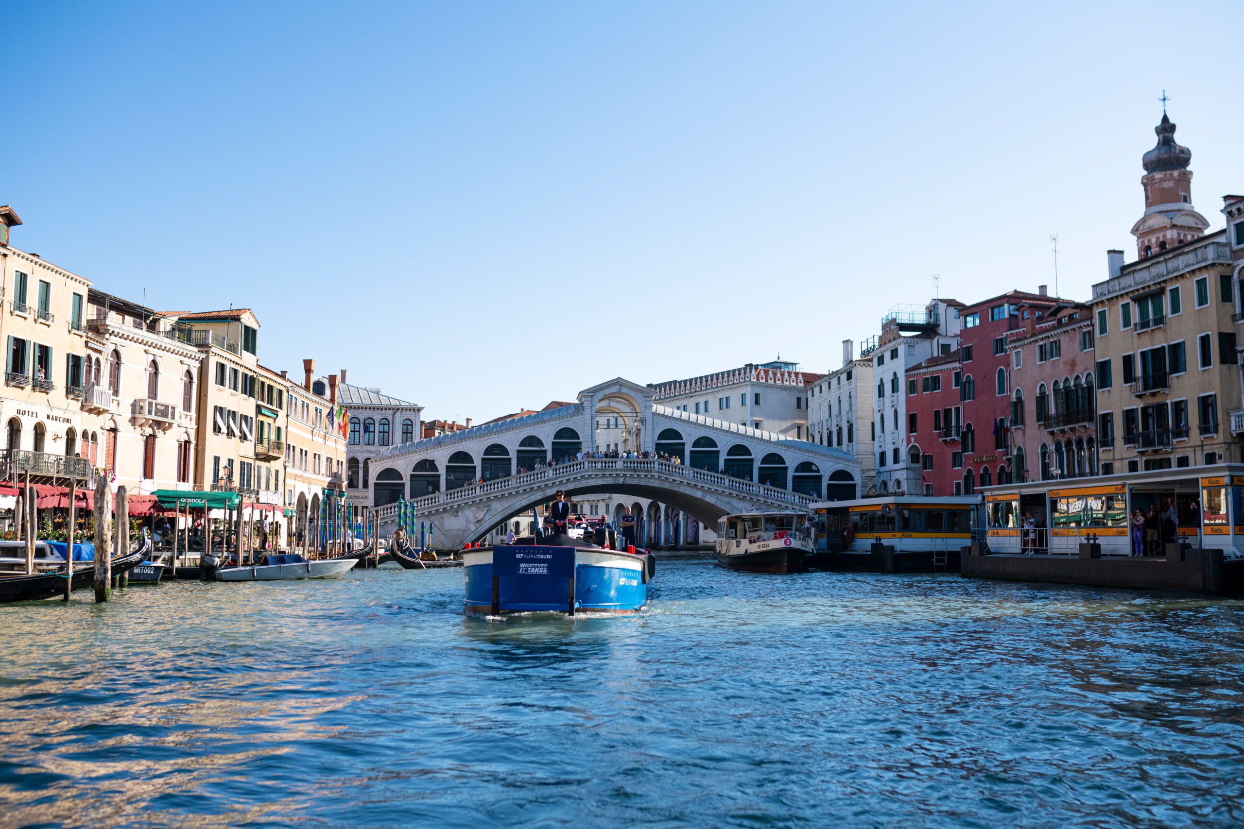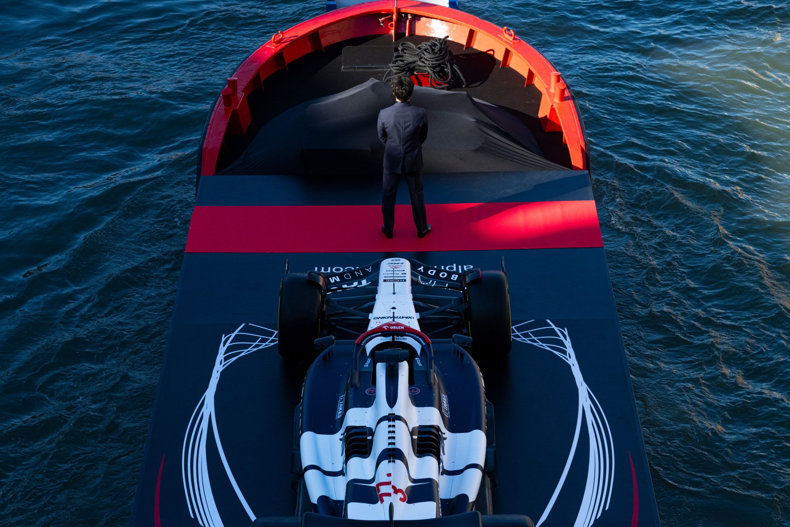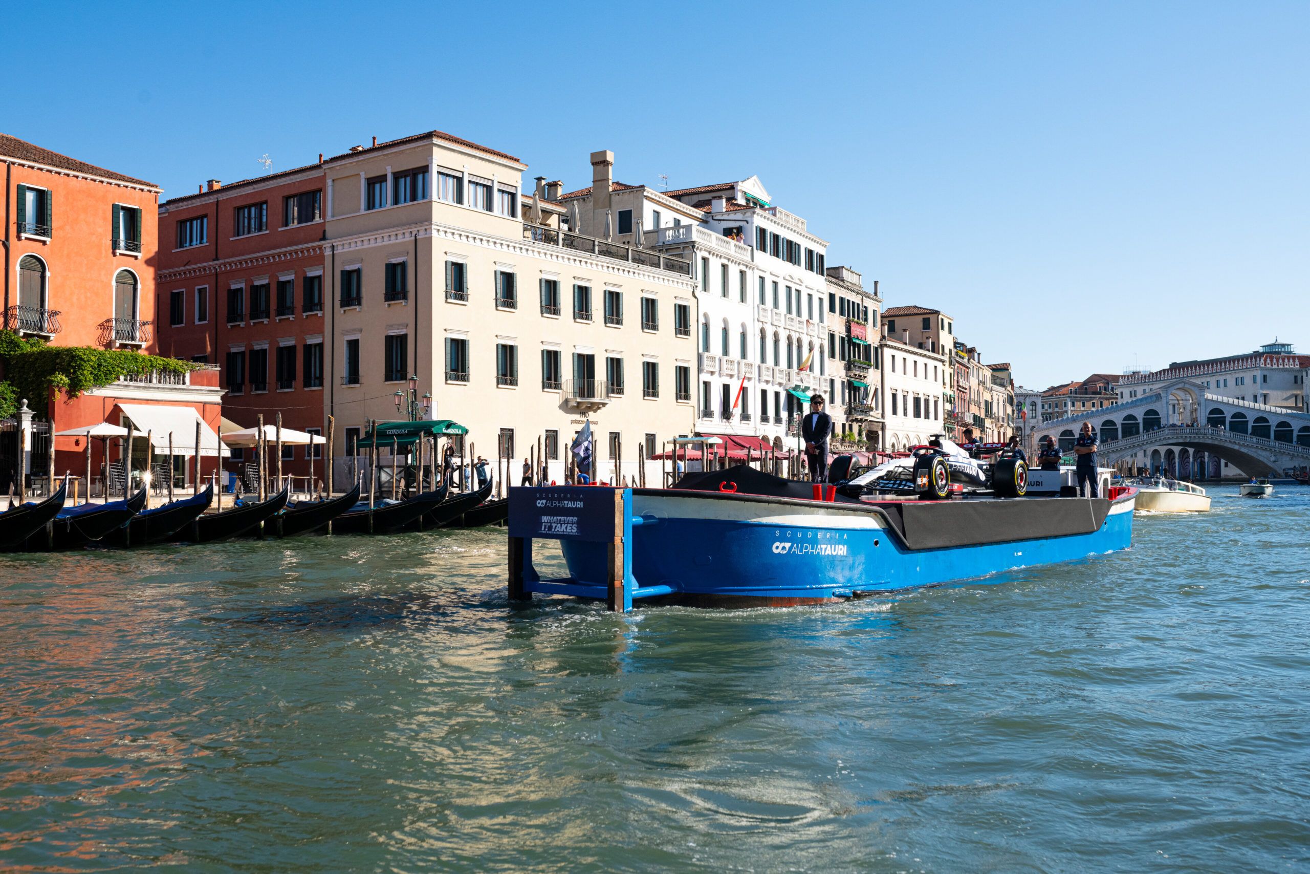 VENICE, ITALY - SEPTEMBER 06: A general view of the Scuderia AlphaTauri AT03 show car and Yuki Tsunoda of Japan on Canal Grande during the Scuderia AlphaTauri Premiere of "Whatever it Takes – the Race before the Races" on September 06, 2023 in Venice, Italy. (Photo by Rudy Carezzevoli/Getty Images for Scuderia AlphaTauri) // Getty Images / Rudy Carezzevoli / Red Bull Content Pool // SI202309060249 // Usage for editorial use only //