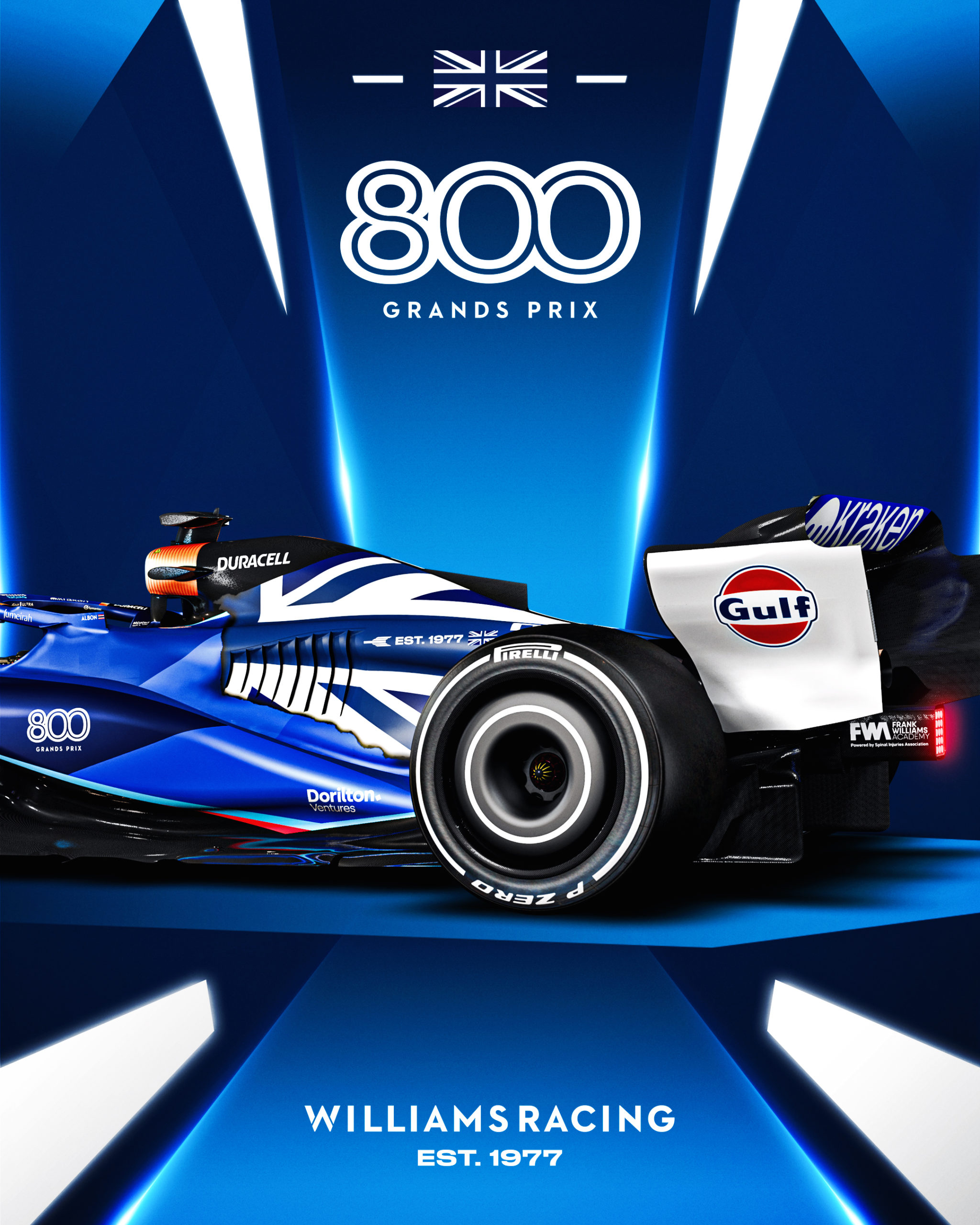 Williams Racing unveils an adapted livery for the British Grand Prix, designed with a British twist, while also acknowledging our past, as part of the celebrations to mark its 800th Grand Prix.