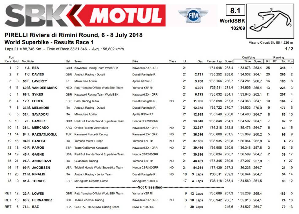 Jonathan Rea, piloto de Kawasaki, dominó de principio a fin la carrera de Misano; obteniendo así su novena victoria en el campeonato. Esta nueva primer posición a final de carrera le ha permitido ampliar la ventaja con Chaz Davies, su rival más directo que pilota sobre los lomos de la Ducati, abriendo la brecha la a 80 puntos en la clasificación general del mundial de Superbikes.